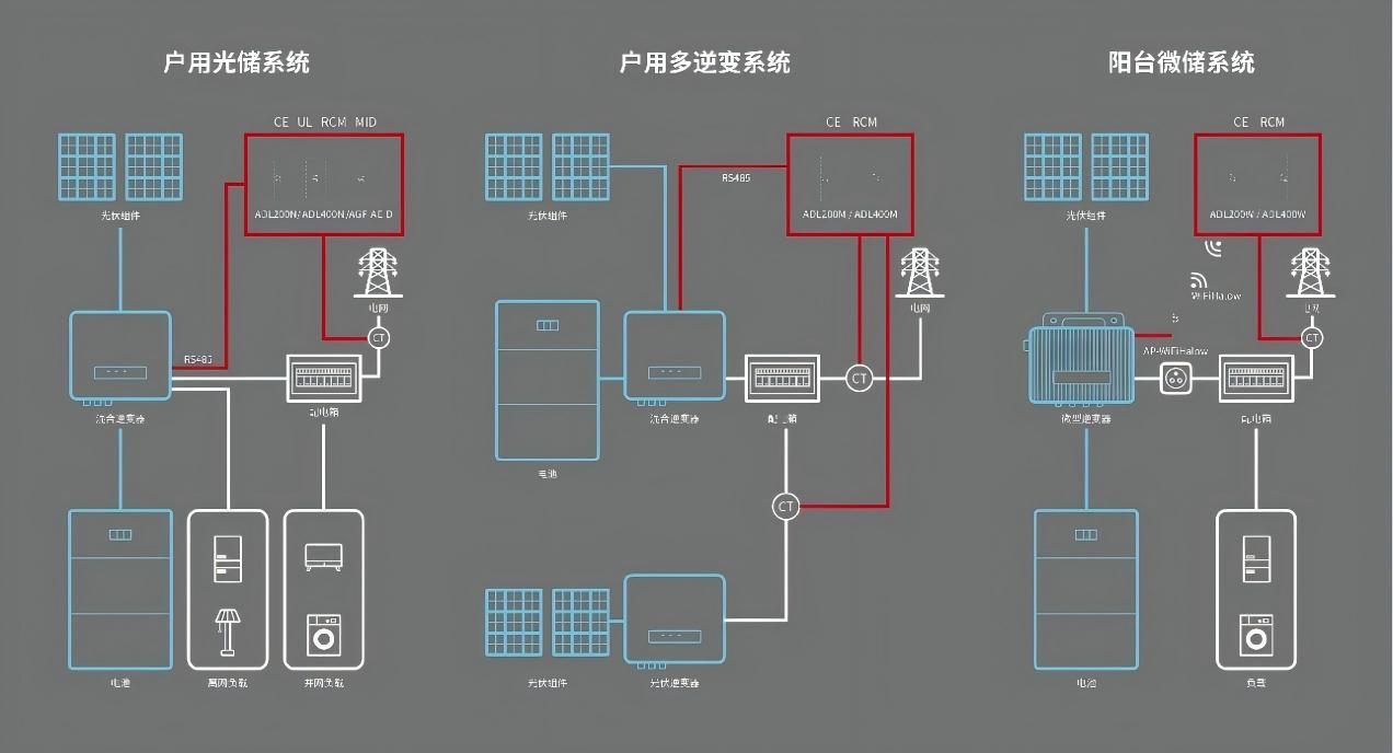 ADL200W/400W memantau arus sambungan grid dalam masa nyata, membolehkan pengehadan arus pantas dalam penyelarasan dengan penyongsang untuk memastikan pematuhan grid.