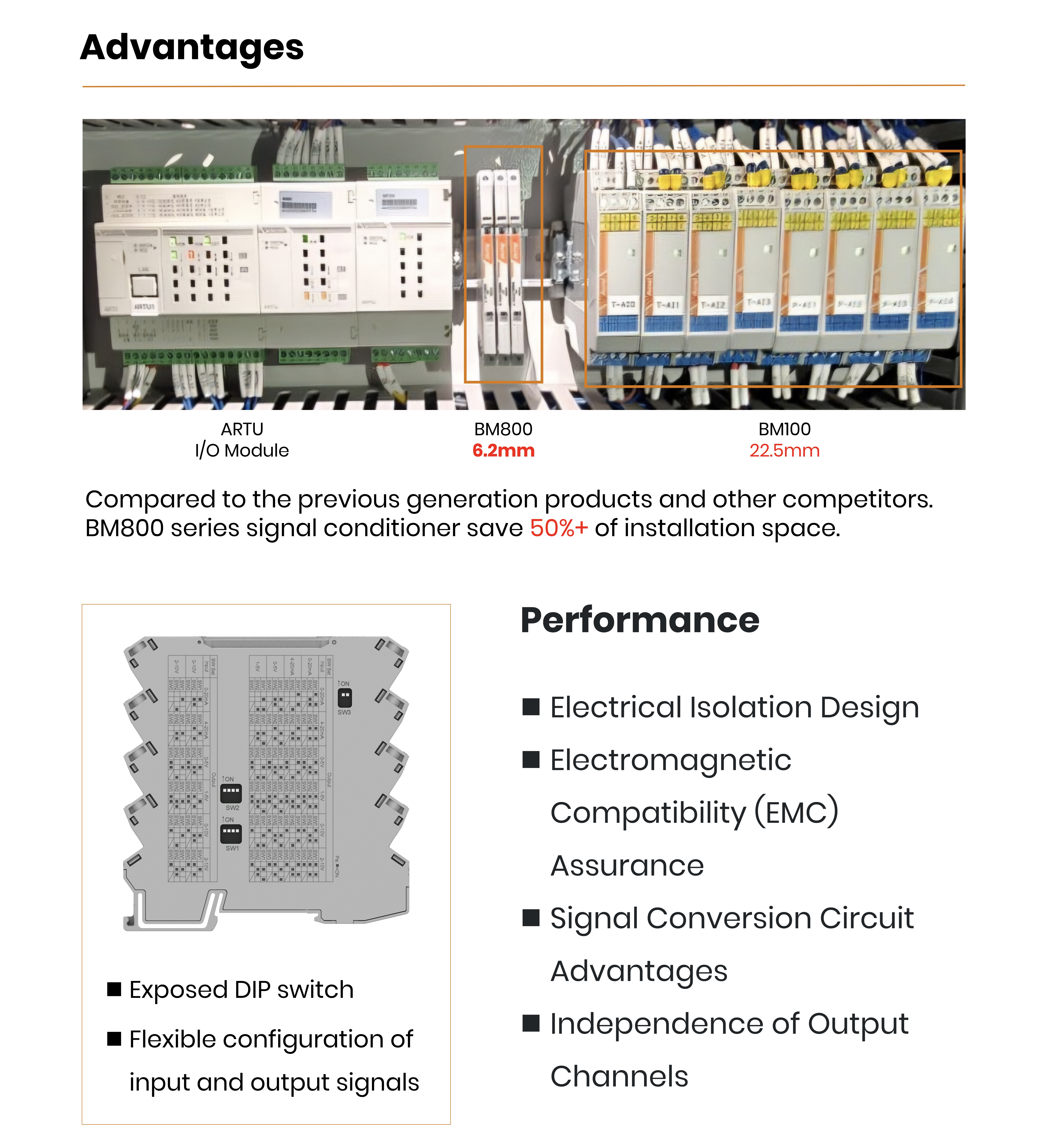 Kondisioner isyarat siri BM800, yang juga dikenali sebagai isolator isyarat, penukar isyarat, dan transduser isyarat, adalah peranti pengkondisian isyarat industri maju dengan reka bentuk 6.2mm yang nipis, menjimatkan lebih 50% ruang pemasangan. Ia mempunyai ketepatan 0.1%, jaminan keserasian elektromagnet, dan ciri -ciri seperti pengasingan elektrik, kelebihan litar penukaran isyarat, dan saluran output bebas. Dengan suis DIP untuk konfigurasi isyarat input dan output yang fleksibel, ia boleh memproses pelbagai isyarat seperti 0/4 ~ 20mA, 0/1 ~ 5V, dan lain -lain. Ia juga mempunyai prestasi yang sangat baik dalam hanyut suhu, masa tindak balas, dan kekuatan penebat.