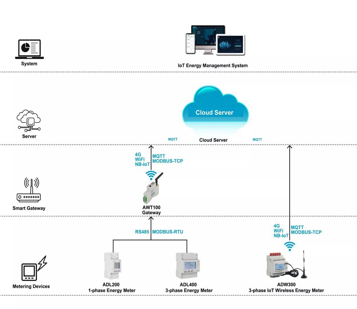 | ADW300 | Meter wayarles ADW300 digunakan terutamanya untuk mengukur kuasa aktif tiga fasa rangkaian voltan rendah. Ia mempunyai fungsi komunikasi komunikasi RS485 dan WiFi/4G/Ethernet/LORA, yang mudah untuk pengguna memantau, membaca dan mengurus penggunaan elektrik. Ia boleh dipasang secara fleksibel di dalam kotak pengedaran untuk mencapai pengukuran kuasa sub-item, statistik dan analisis kawasan yang berbeza dan beban yang berbeza. | |